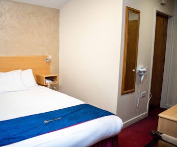 Welcome to our Classic Double Room, a charming retreat where comfort and convenience combine to ensure a delightful stay for two. This thoughtfully designed space features a generously sized double bed, offering the perfect setting for a restful night’s sleep. The en suite bathroom adds a touch of luxury, with complimentary toiletries, soft linens, plush towels, and a cosy bath mat to enhance your experience. A dedicated desk and chair provide a comfortable workspace for productivity or relaxation, while the wardrobe and luggage rack offer convenient storage for your belongings. Stay refreshed with complimentary tea and coffee in the room, and enjoy the use of an iron and ironing board to keep your attire in perfect condition. High-speed fibre optic broadband Wi-Fi is available throughout the property, ensuring you can easily stay connected, whether catching up on emails or planning your next adventure. After a day of exploring or business, unwind in our hotel’s cosy pub, offering a curated selection of beers, wines, whiskies, and cocktails—ideal for relaxation and socializing. Parking is made easy with our secure on-site car park, available at a nominal charge. For those flying, enjoy the convenience of our affordable parking option, a perfect alternative to costly airport fees. We are committed to ensuring your comfort and satisfaction, and we look forward to making your stay in our Classic Double Room a memorable one.